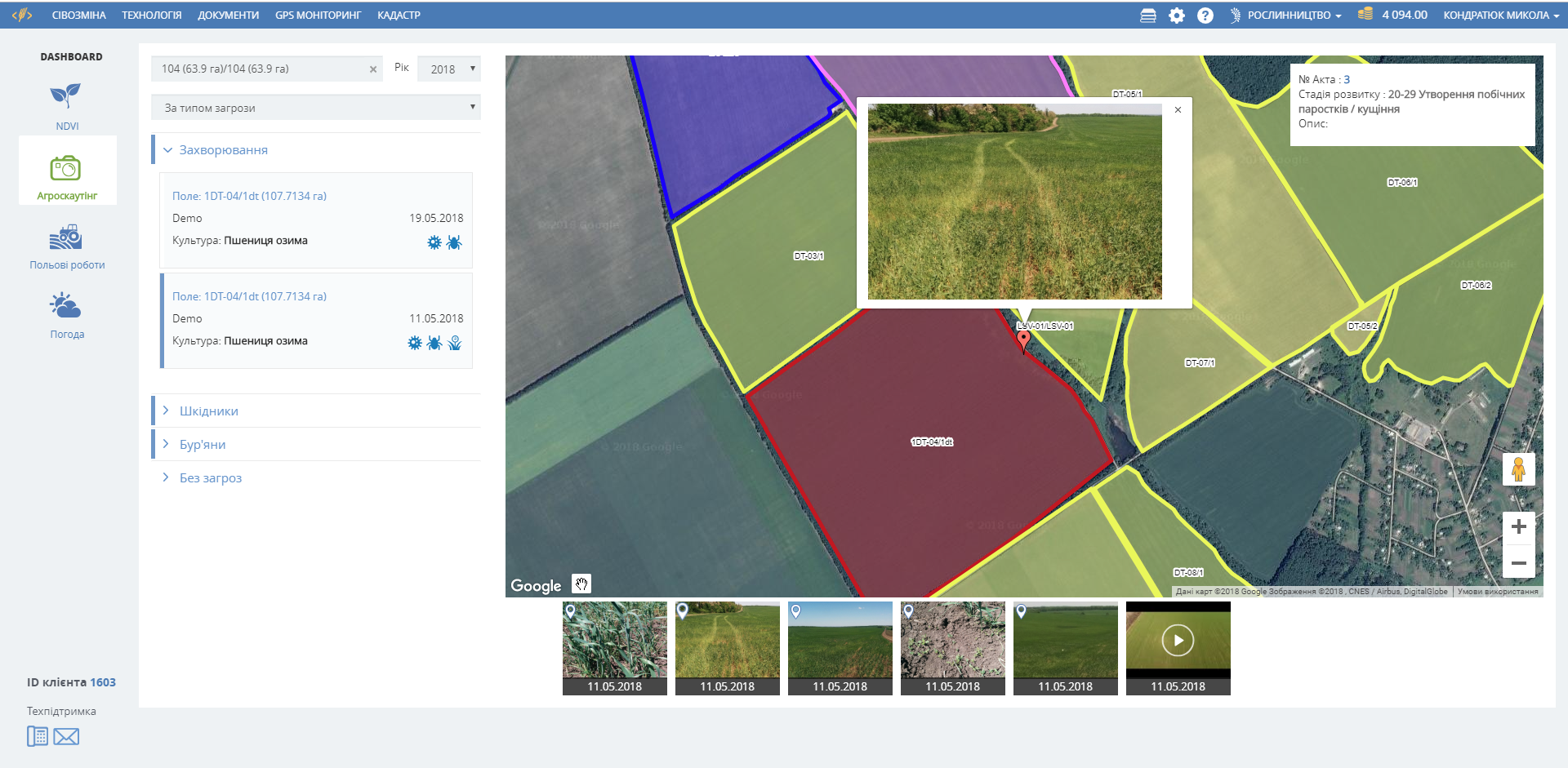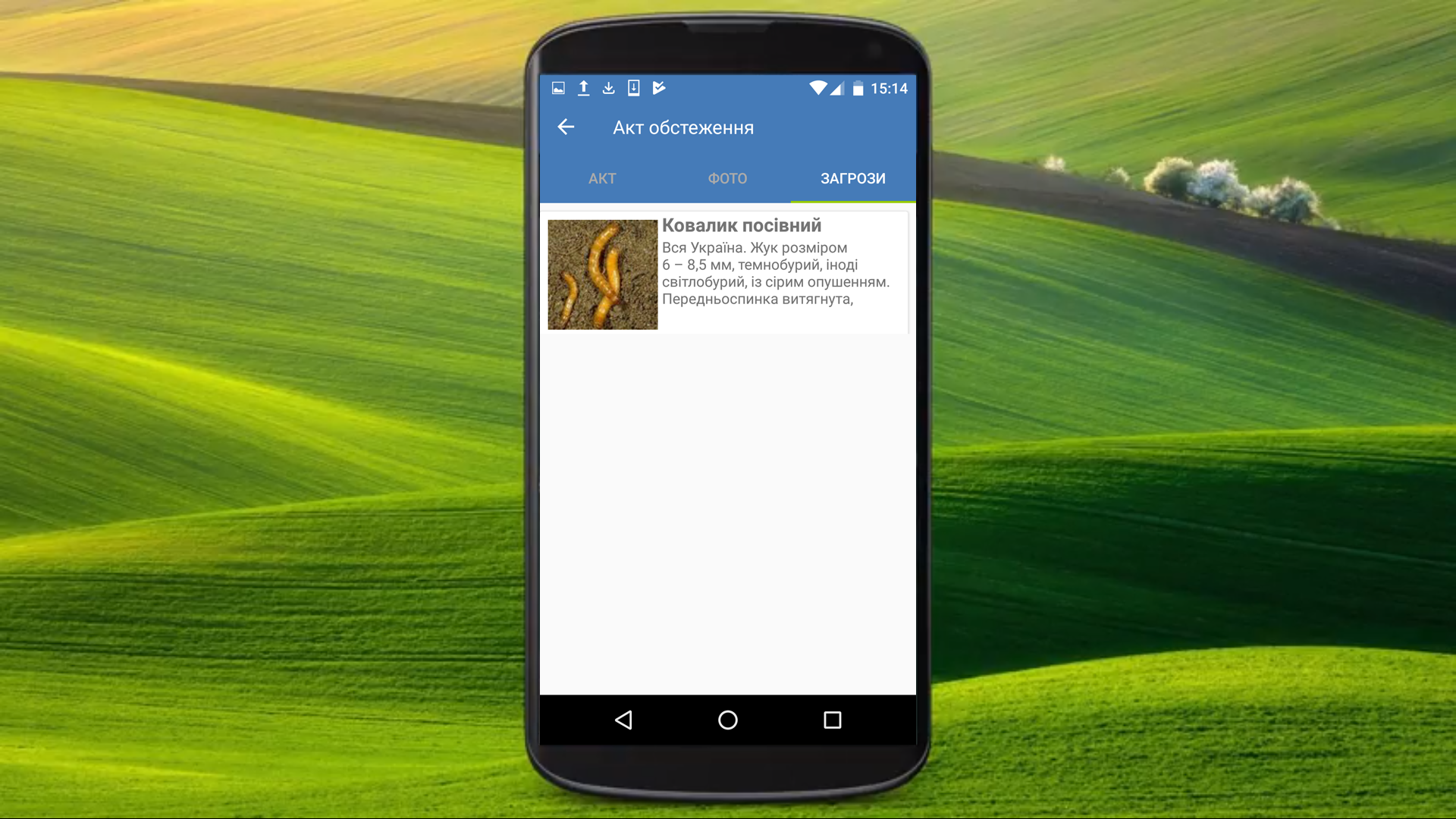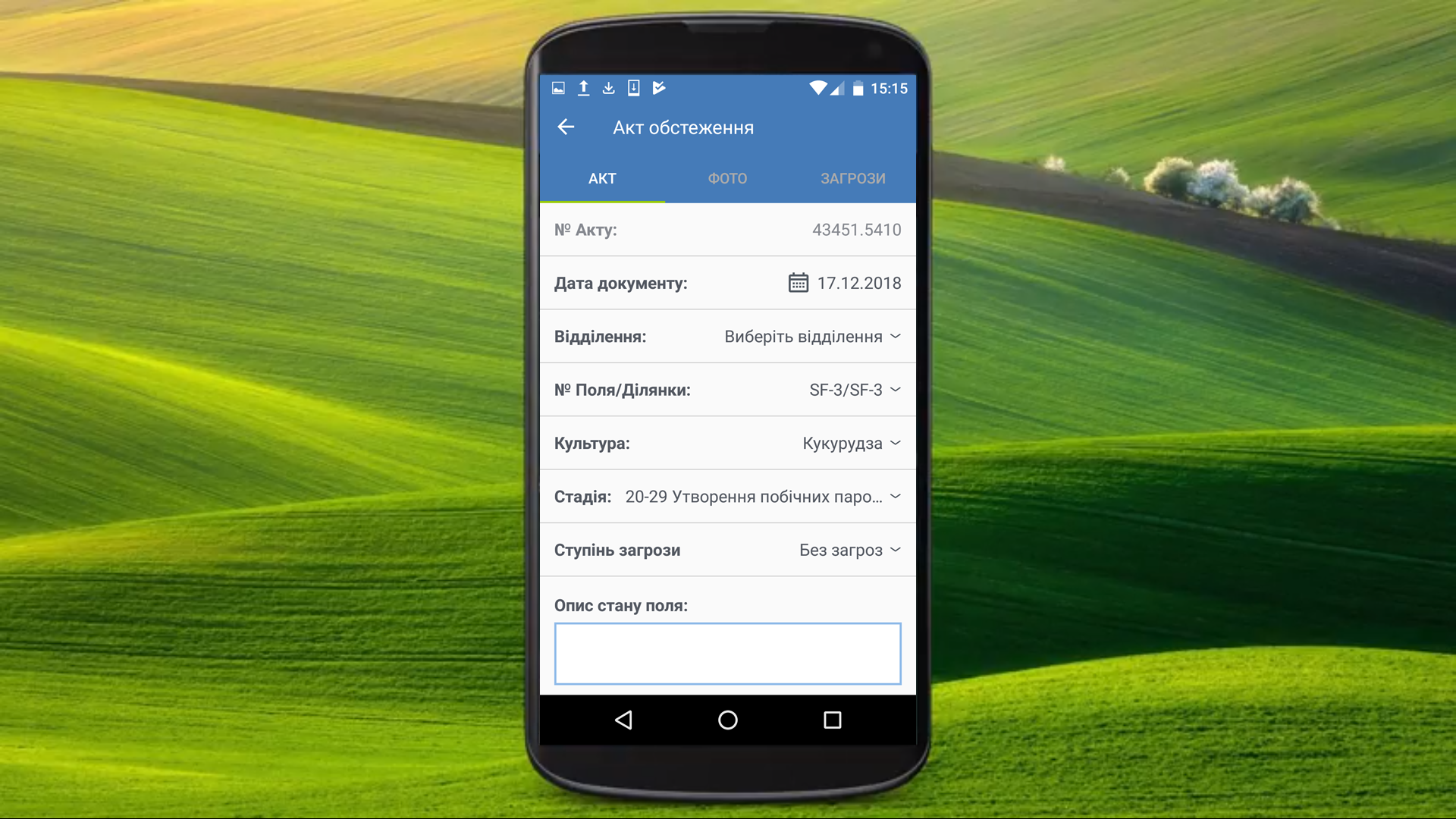 A mobile application is an assistant to an agronomist during a routine field survey and report compilation. The agronomist goes out to the field, examines the crops and when identifying problem areas, pests, diseases, weeds, takes photos using the application. At the same time, the mobile device records the GPS coordinates of the photo and adds information to the report: